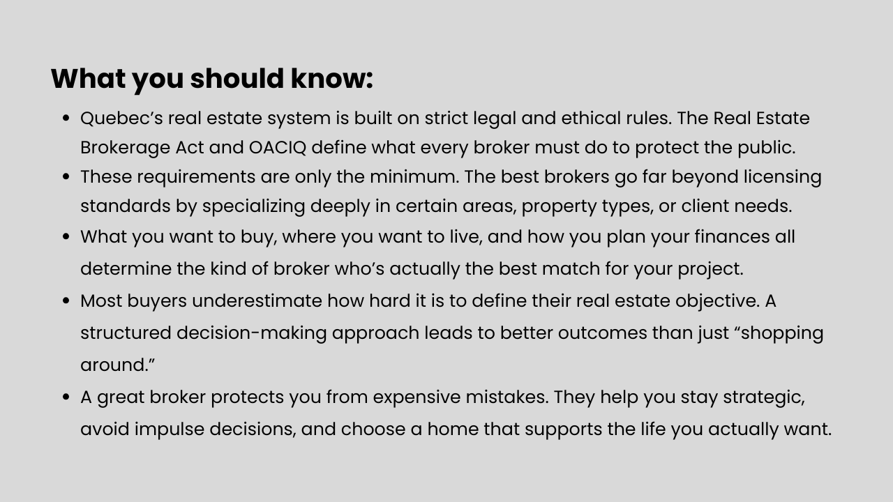 - The legal and ethical framework (OACIQ + Real Estate Brokerage Act)